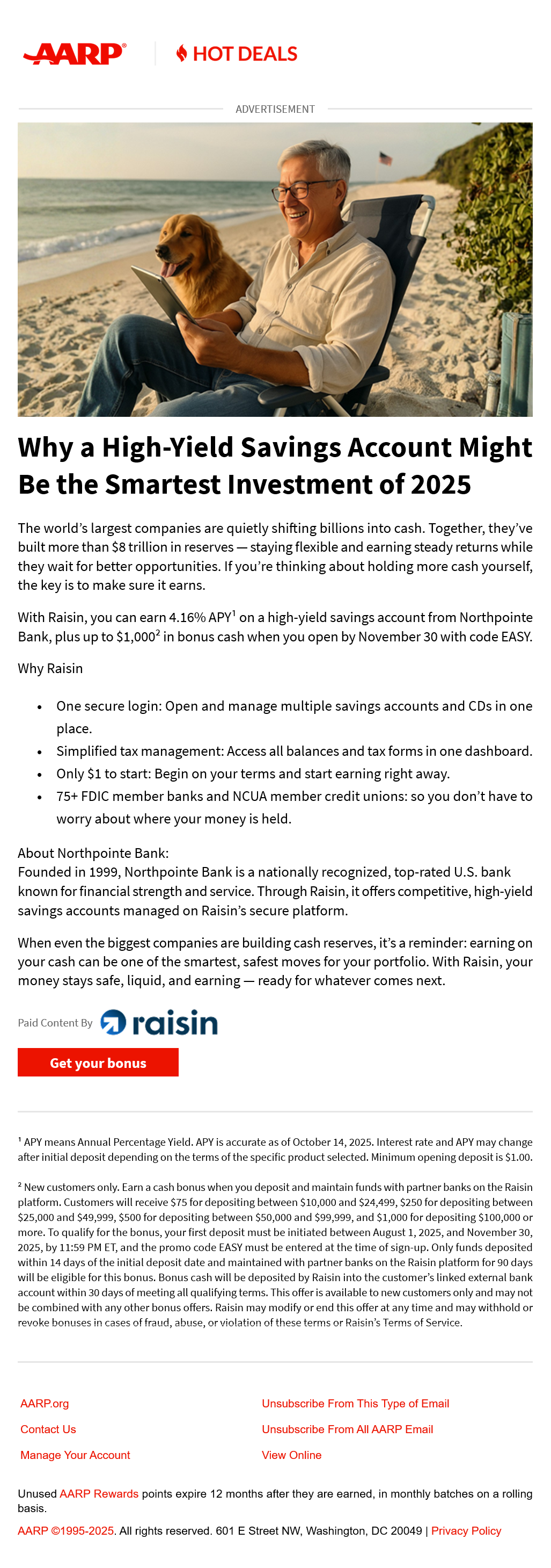 AARP members love a deal. So it’s no surprise that Hot Deals, an opt-in email designed to deliver timely deals and discounts, is the fastest growing and highest performing AARP email. Delivered under the trusted AARP heading, this transactional email flags your special offer with your logo, URL, product shot, copy and call-to-action in one impactful message. It’s an opportunity to position your product front and center without the distraction of competing products and services.